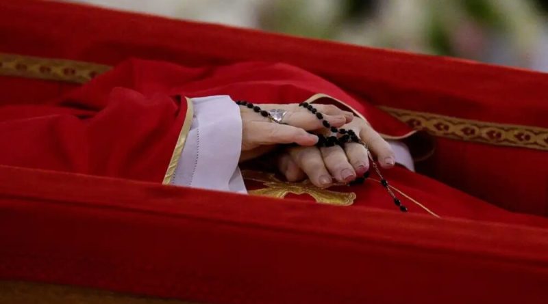 De acordo com a Santa Sé, o caixão foi colocado em frente ao Altar da Confissão, na Basílica de São Pedro, onde o coro cantou a Ladainha dos Santos em latim “para o repouso de sua alma”. O cardeal camerlengo Kevin Farrel conduziu uma breve liturgia que incluiu uma leitura do Evangelho de João sobre o amor de Jesus por seus discípulos.