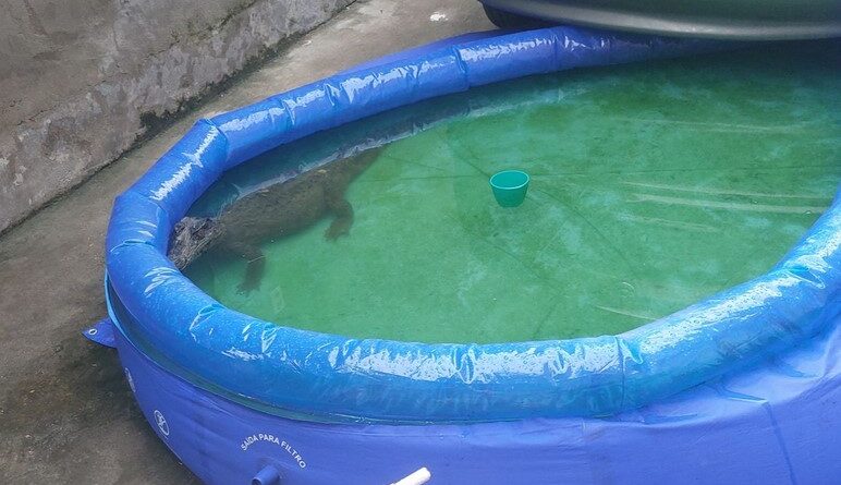No último domingo, um jacaré foi encontrado dentro de uma piscina de plástico no quintal de uma casa no bairro São José, zona Leste de Manaus.